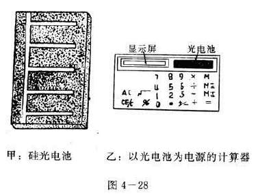 光电池是一种将光能转化为电能的电池。硅光电池(图4-28)是一种典型的光电池。它的主要部分用硅制成。这种电池性能稳定,使用寿命长,已广泛用到电子计算器、收音机、玩具等方面,在人造卫星和其他太空仪器上常用硅光电池作为电源。由于目前光电池的成本高,而且能量转换效率较低,限制了它的应用范围。